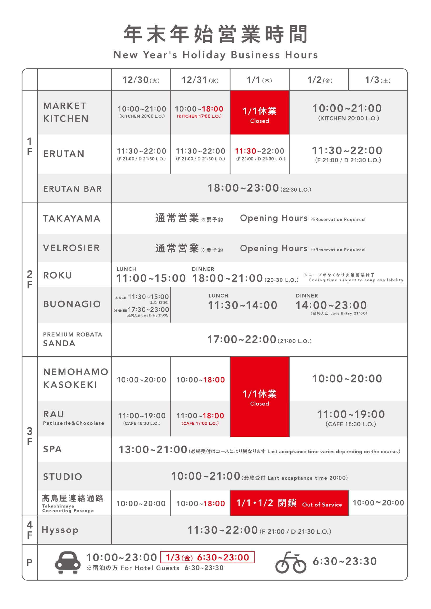 お客様にはご不便をおかけいたしますが、ご理解いただけますようお願い申し上げます。 年末も、新しい年も、皆様のお越しを心よりお待ちしております。