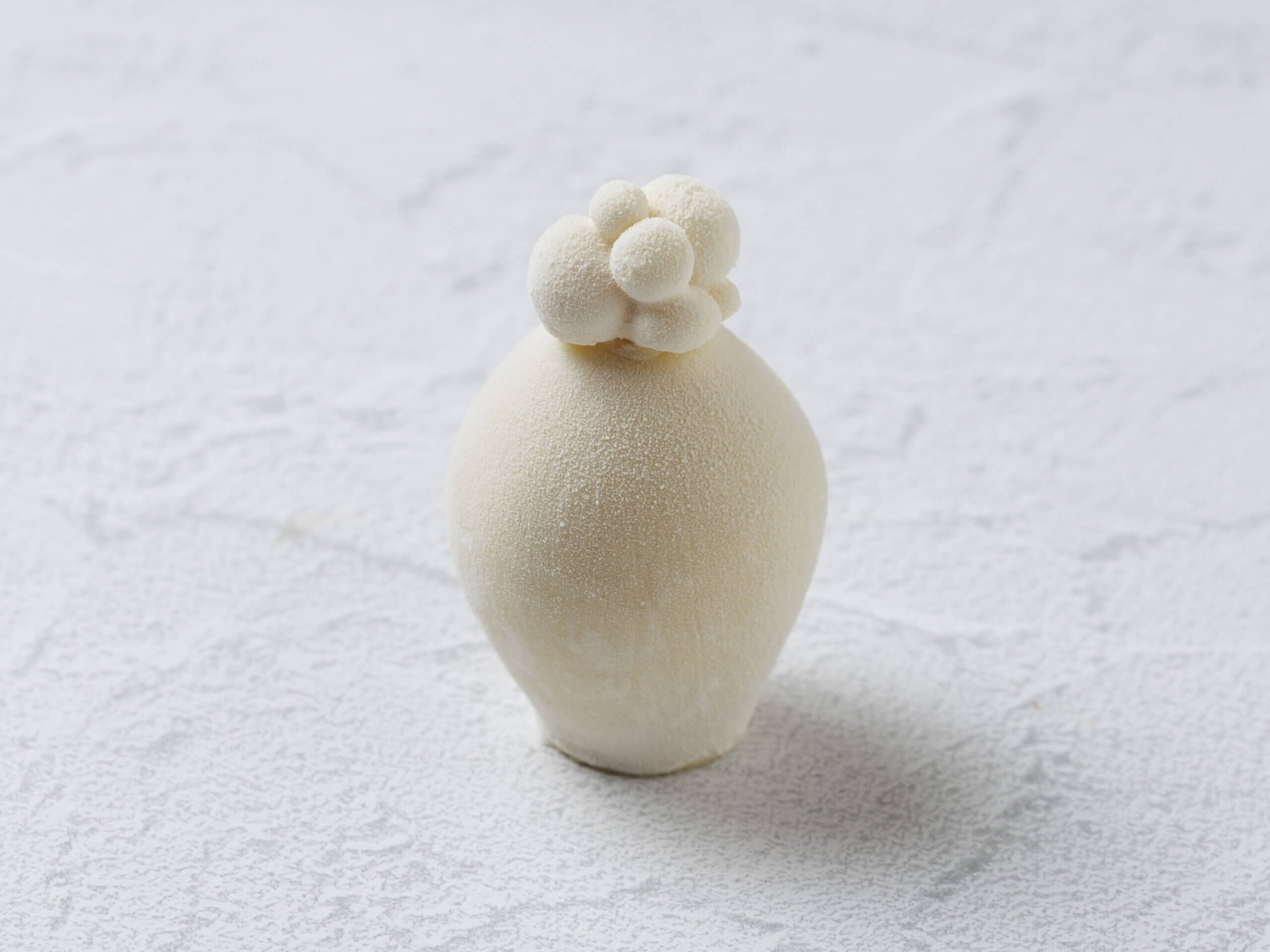 雲にかかった雪化粧の山の情景を浮かべ、形状に落とし込んだデセール。