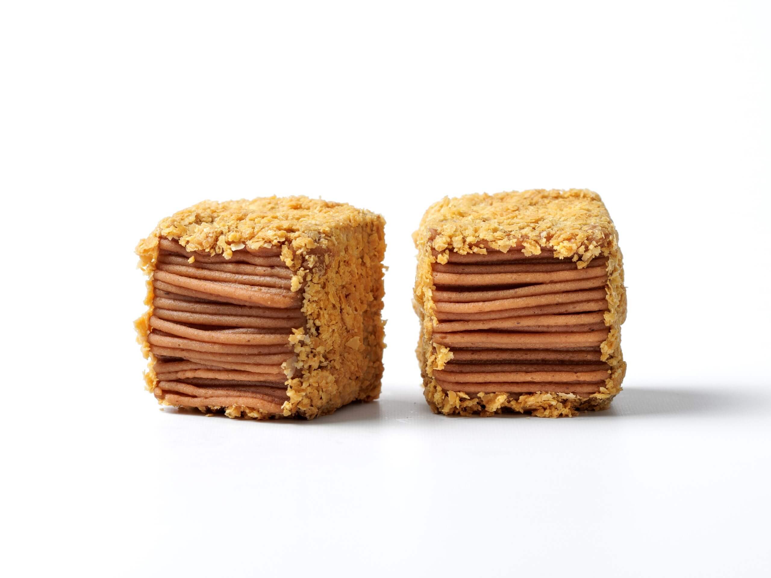 カットすると組み合わさったパーツが地層を思わせ、ヘーゼルナッツプラリネペーストが、