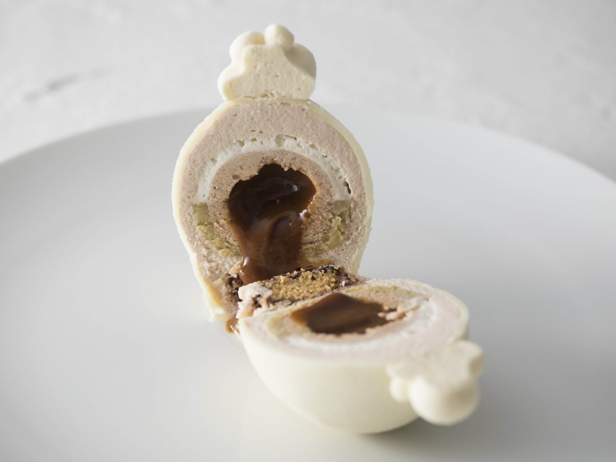 和栗のクリームと、仄かにイランイランが香る洋栗のムースに包まれた濃厚なプラリネソースを使用。