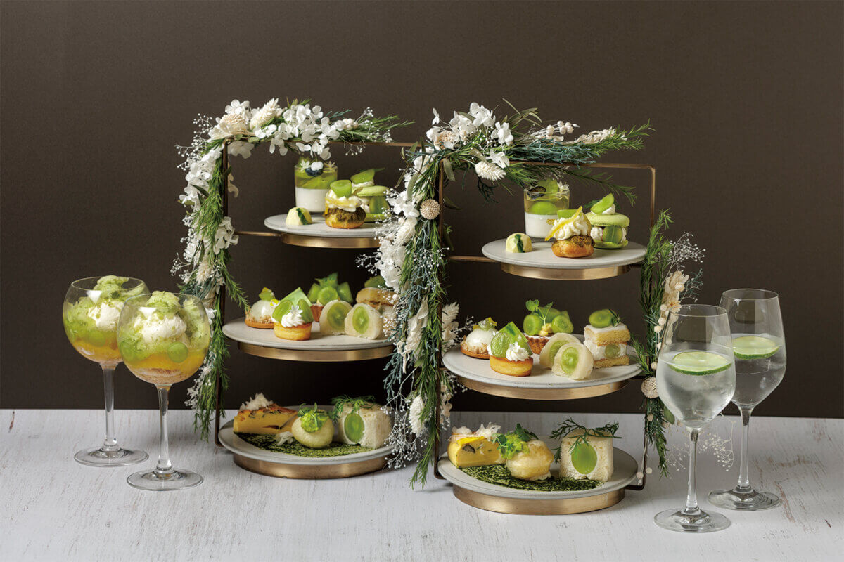 緑と白を基調とした爽やかなフラワースタンドに並ぶのは、全9種類の可愛らしいデザートたち。ムースやタルト、ヴェリーヌ、マカロン、そしてボンボンショコラなど、多彩なスイーツでシャインマスカットの魅力をご堪能いただけます。