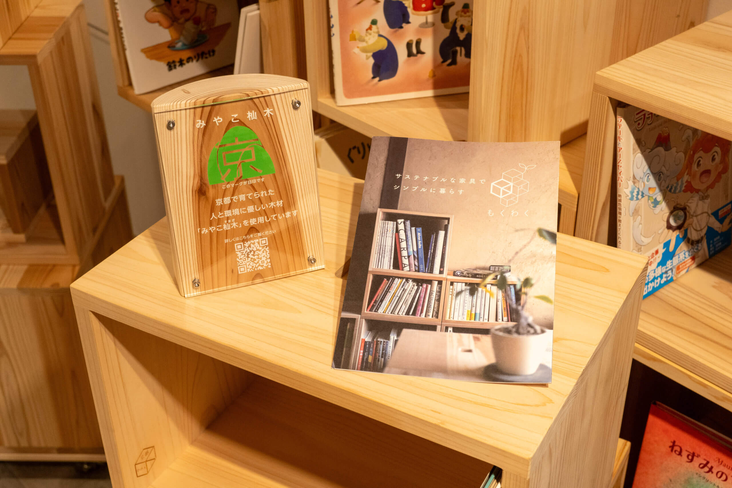 本をつなぐ本棚は「sumao すまいの雑貨店(京都市中京区)」の「もくわく®︎」を使用しています。「もくわく®︎」は、「森と暮らしを環る」をコンセプトに、生活の中に気軽に木を取り入れながら、使い捨ての家具を減らす提案をしています。日本の森を守ることに賛同する各地の製材所で作られており「木の地産地消」を推進しています。